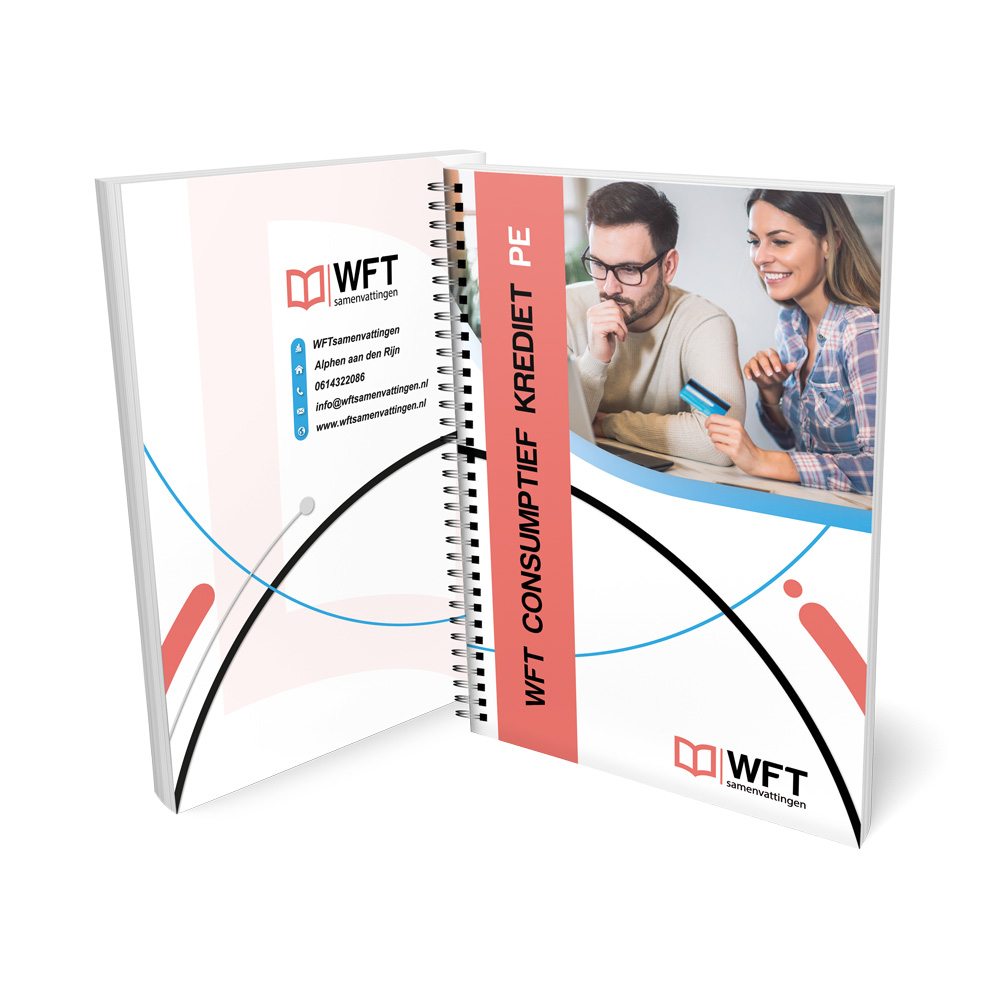 Aan het leren voor je Wft PE examen? Maak gebruik van onze Wft Consumptief Krediet PE Samenvatting. Zo kun jij alle actualiteiten op het gebied van Wft Basis en Consumptief Krediet snel en eenvoudig uit je hoofd leren. De Samenvatting bestaat uit 38 pagina’s en is geschreven op basis van het nieuwste cursusmateriaal van NIBE-SVV.